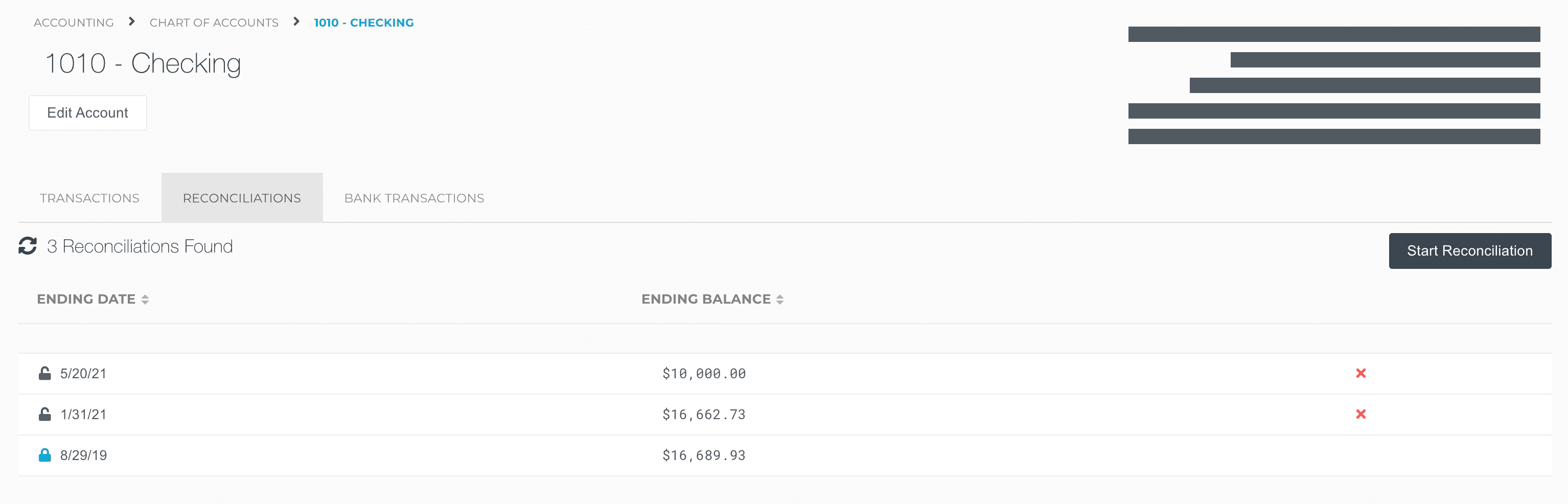 Then, open up the reconciliation in accounting by going to Chart of Accounts, open the account, and click to the Reconciliations tab.