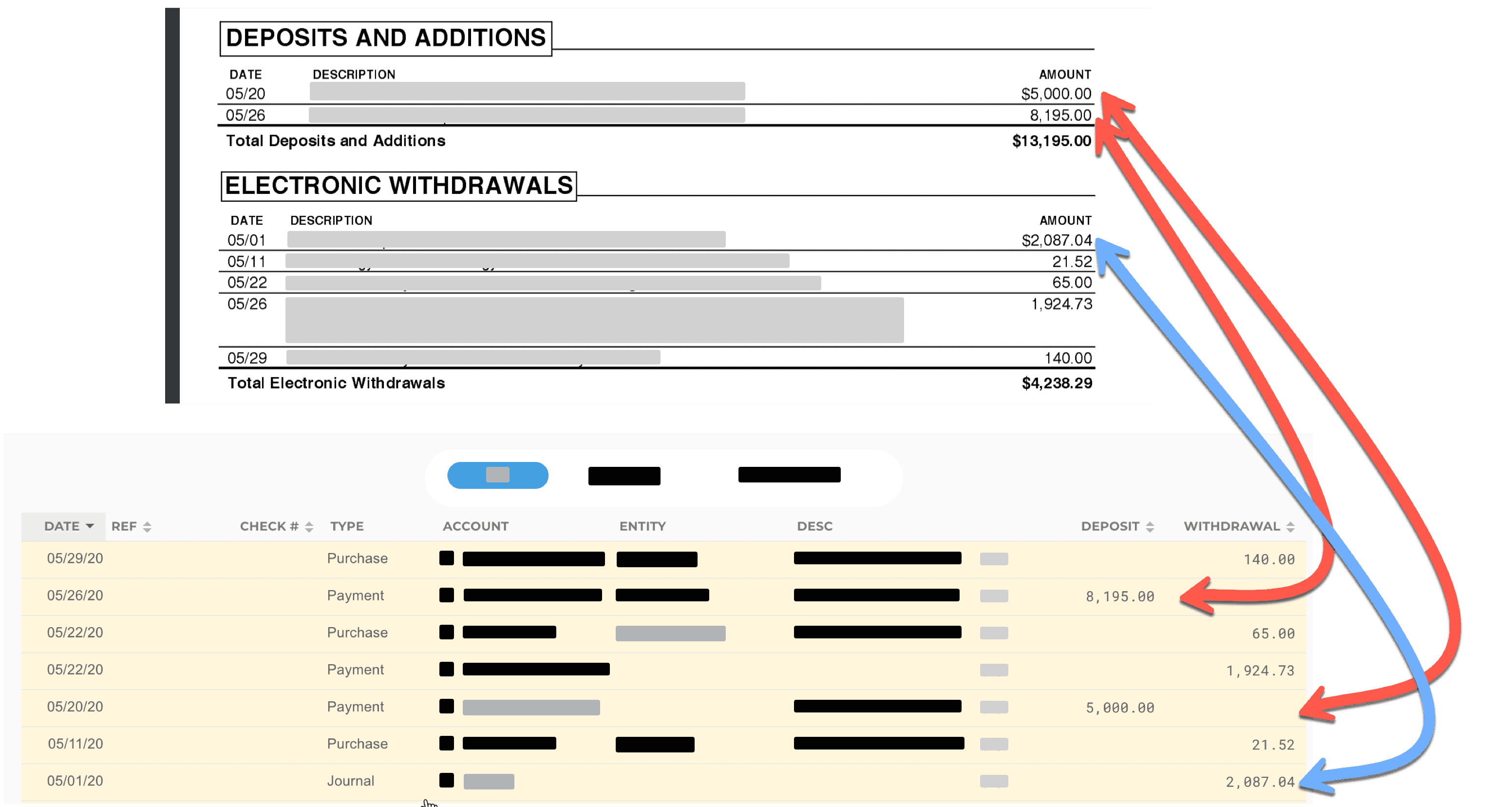 On your bank statement, go through each transaction one-by-one and find the transaction in the reconciliation list. Once you've found it, click the checkboxes to reconcile it.