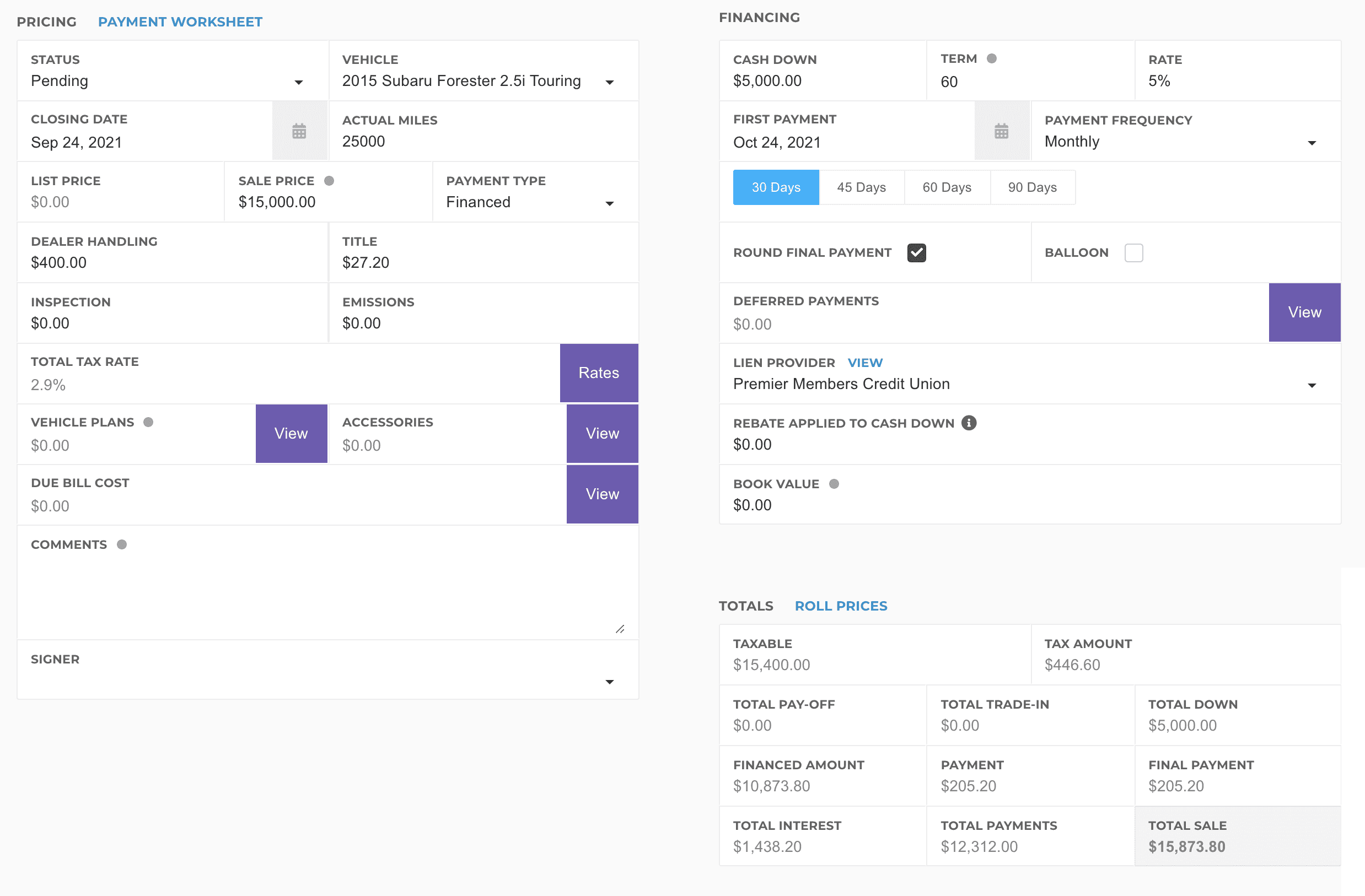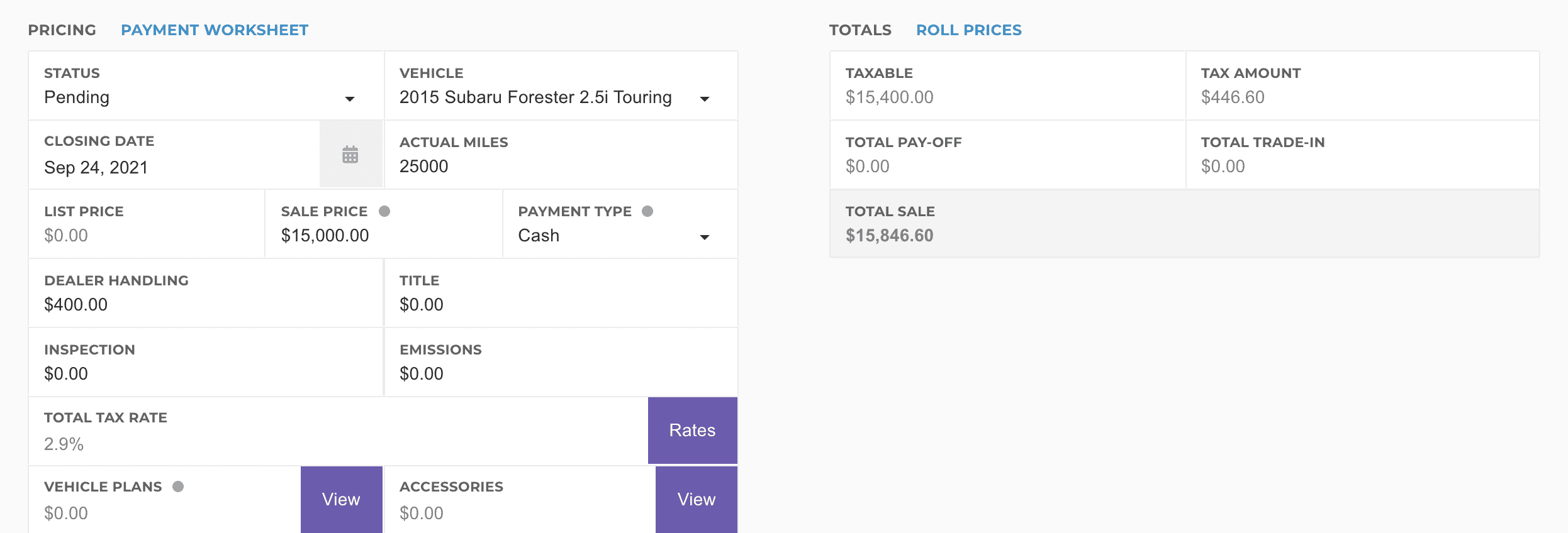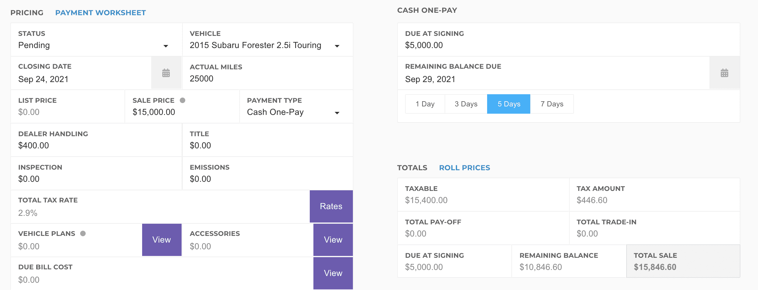 Cash deals are easy to structure, and have no payment terms. The customer is expected to pay the full balance in cash or using a trade-in.