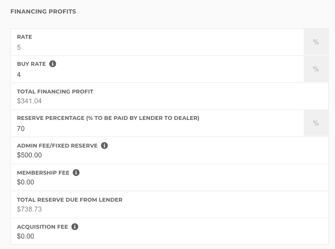 Total Reserve Due from Lender is calculated using all the other values in the Financing Profits section. This amount will be added (whether positive or negative) to the receivable amount from your lender.