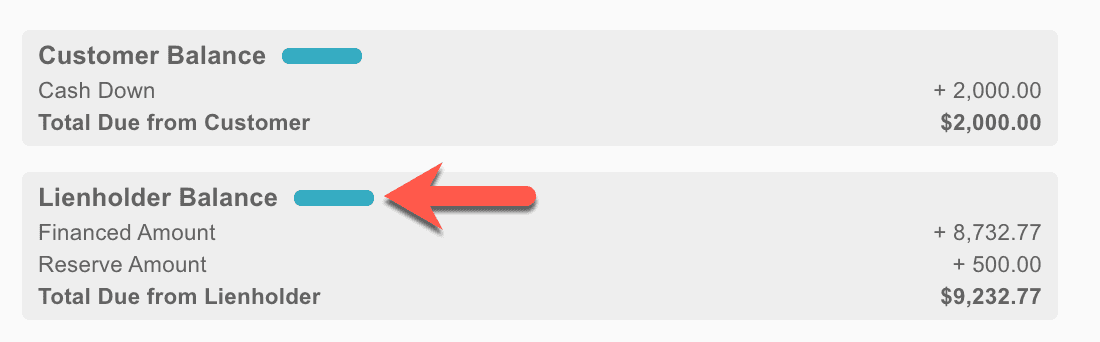 Balances are shown for the deal for the customer, lienholder, and lessor based on the deal structure.