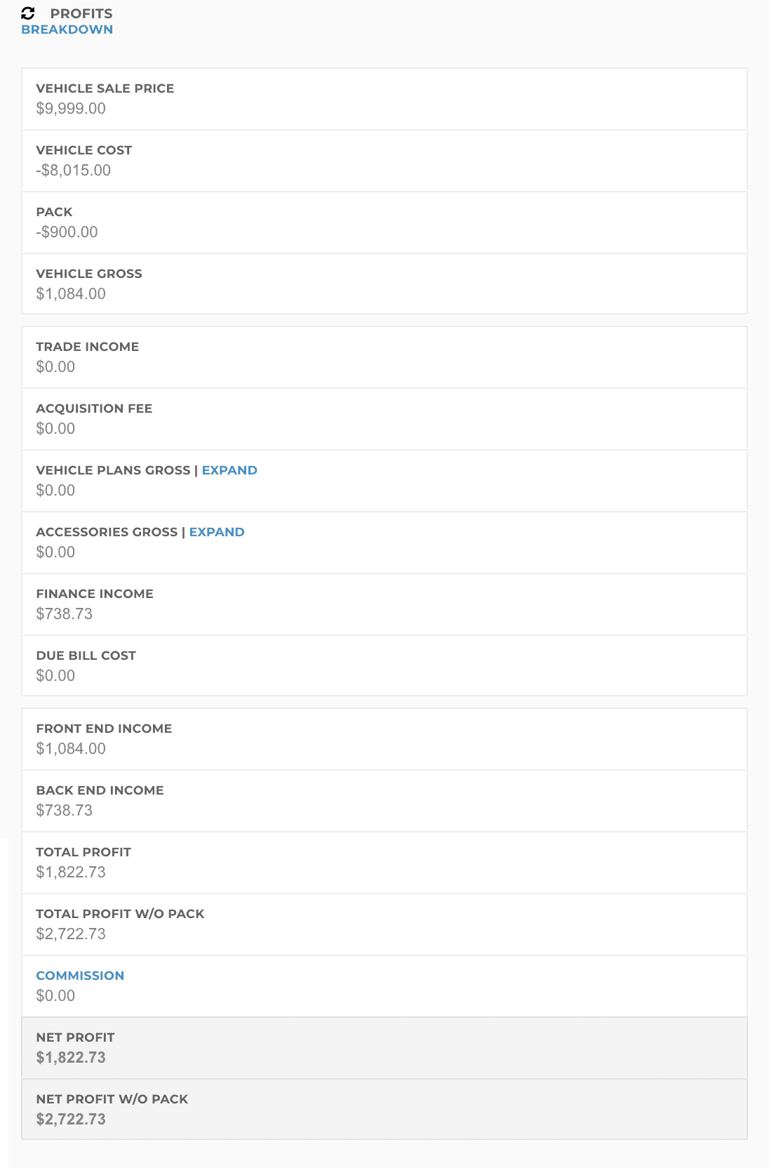 The Profits section shows you a breakdown of the profit calculations on the deal.