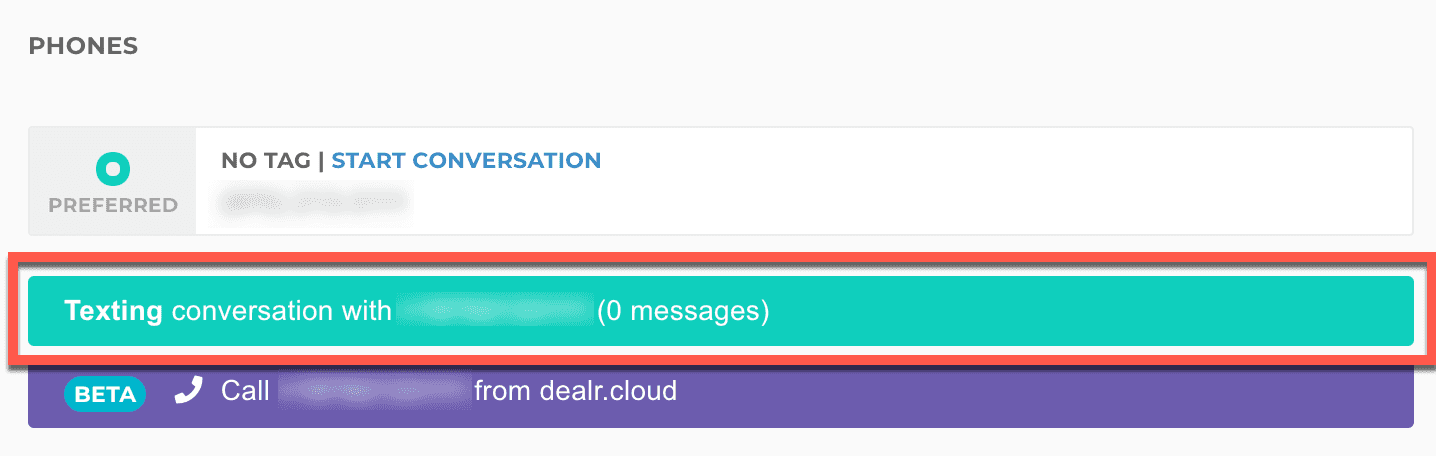 Clicking the texting conversation button will open up a chat dialog where you can send the lead messages: