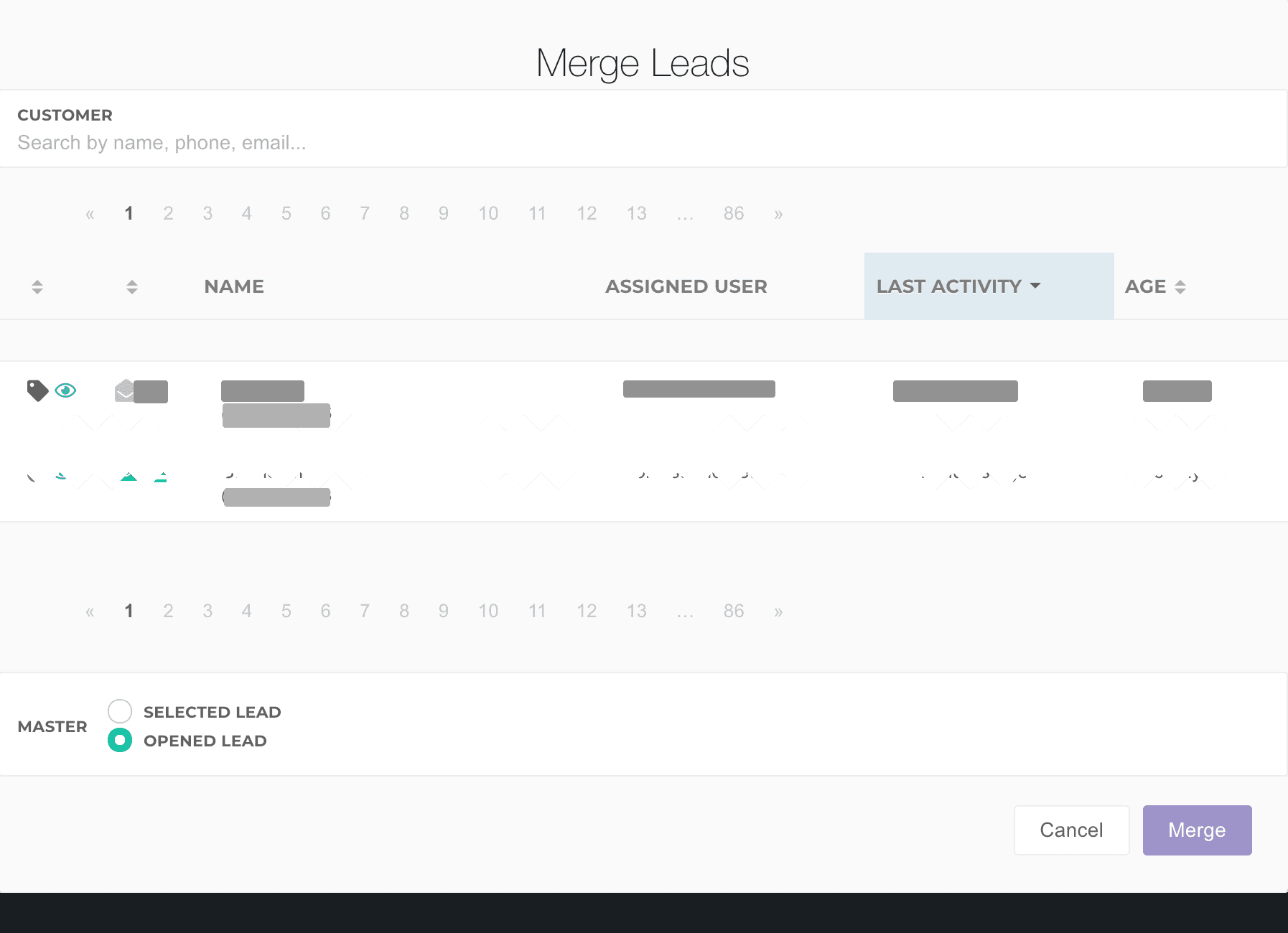 Merging allows you to connect and merge leads that are for the same customer(s). Anytime a customer submits multiple leads, or leads get created by different salespeople, you'll have duplicates that should get merged.