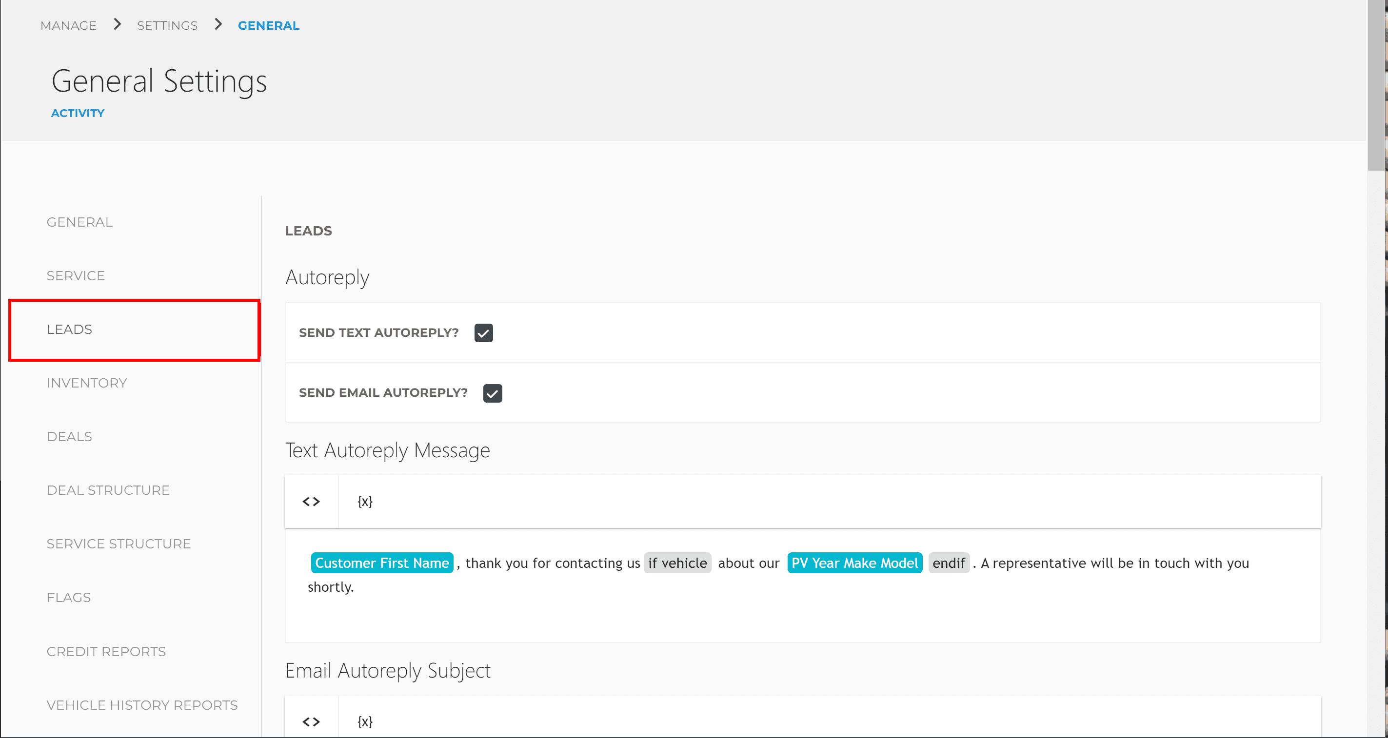 Your Leads Settings page can be located inside your General Settings, which is accessible by navigating to Manage > Settings > General. Next, you'll need to select the Leads tab on the left-hand submenu. This will bring you to your Leads Settings page.