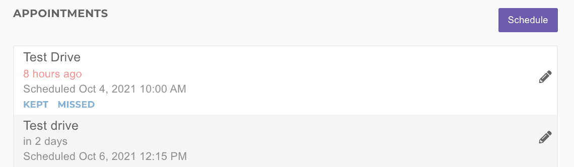 Appointments track when a customer is coming into the store to look at or purchase your vehicle. You can schedule appointments and track whether an appointment is kept.