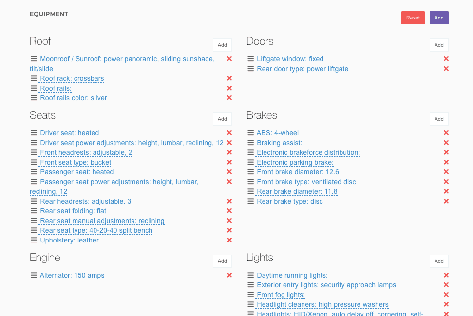 We also allow you to edit the standard equipment when it is necessary. To remove a new equipment or feature, you can click on the red X button next to the line item in question and follow the prompts. To add a new equipment or feature, you can click on the purple Add button in the top right corner of the Standard Equipment area.