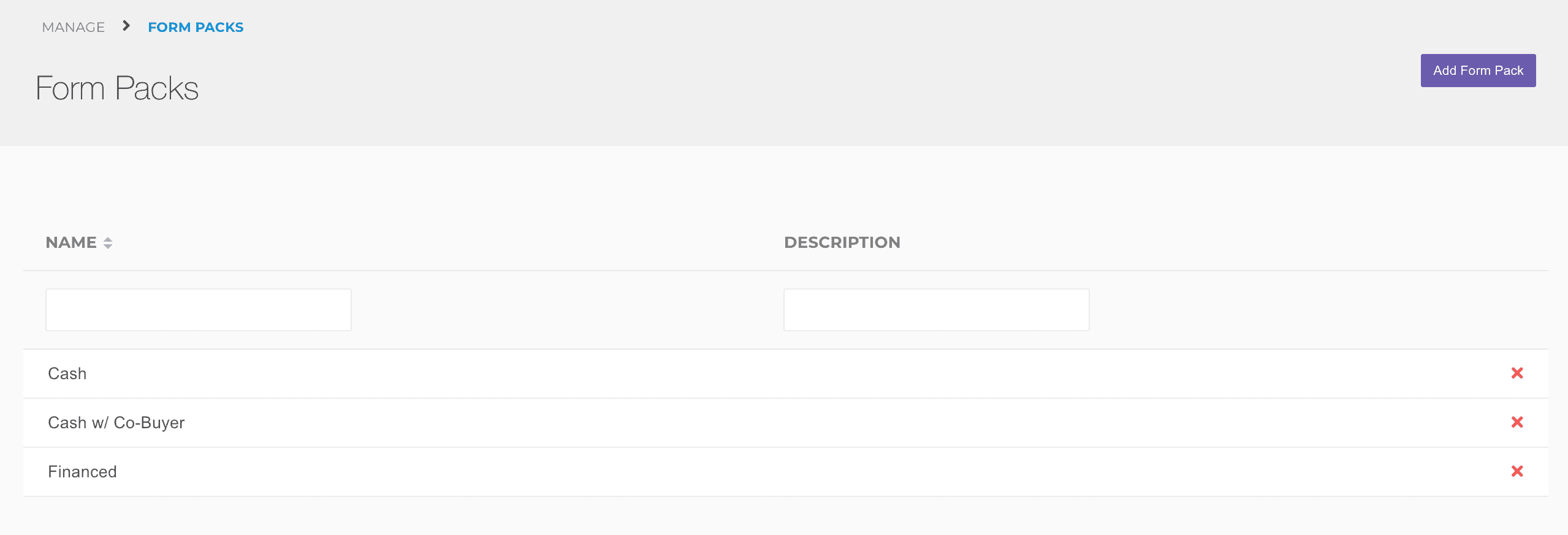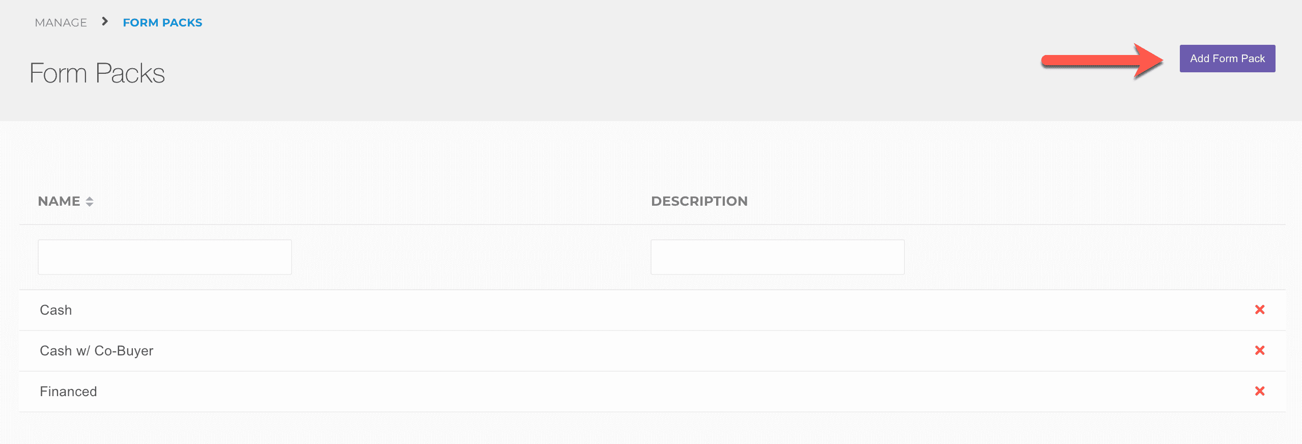 Navigate to Manage > Form Packs and then create a form pack by clicking the Add Form Pack button. Once your form pack is created, you can edit to copy an existing form pack, add forms, and more!