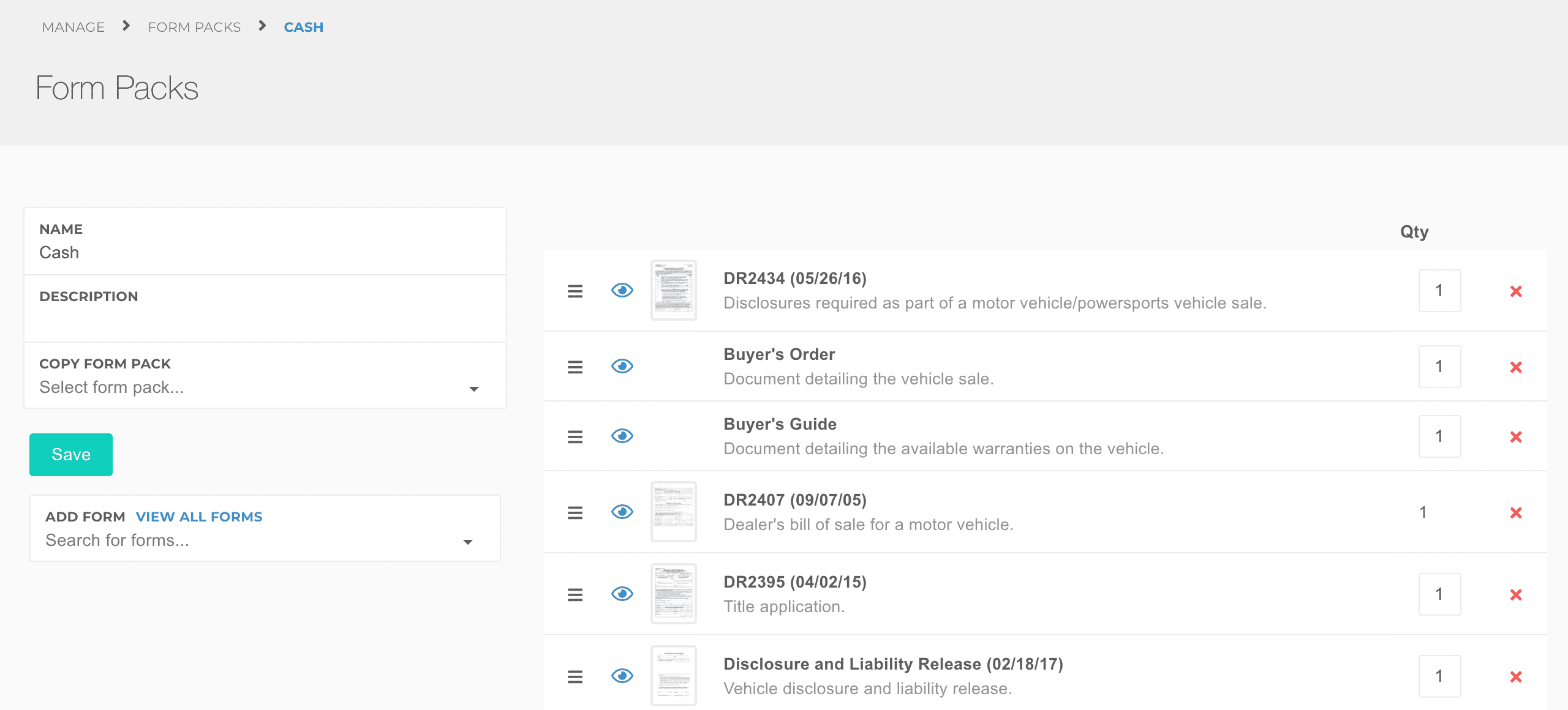 Form Packs are used to create collections of forms that are printed for specific deal types. Some examples of form packs you might want to have:
