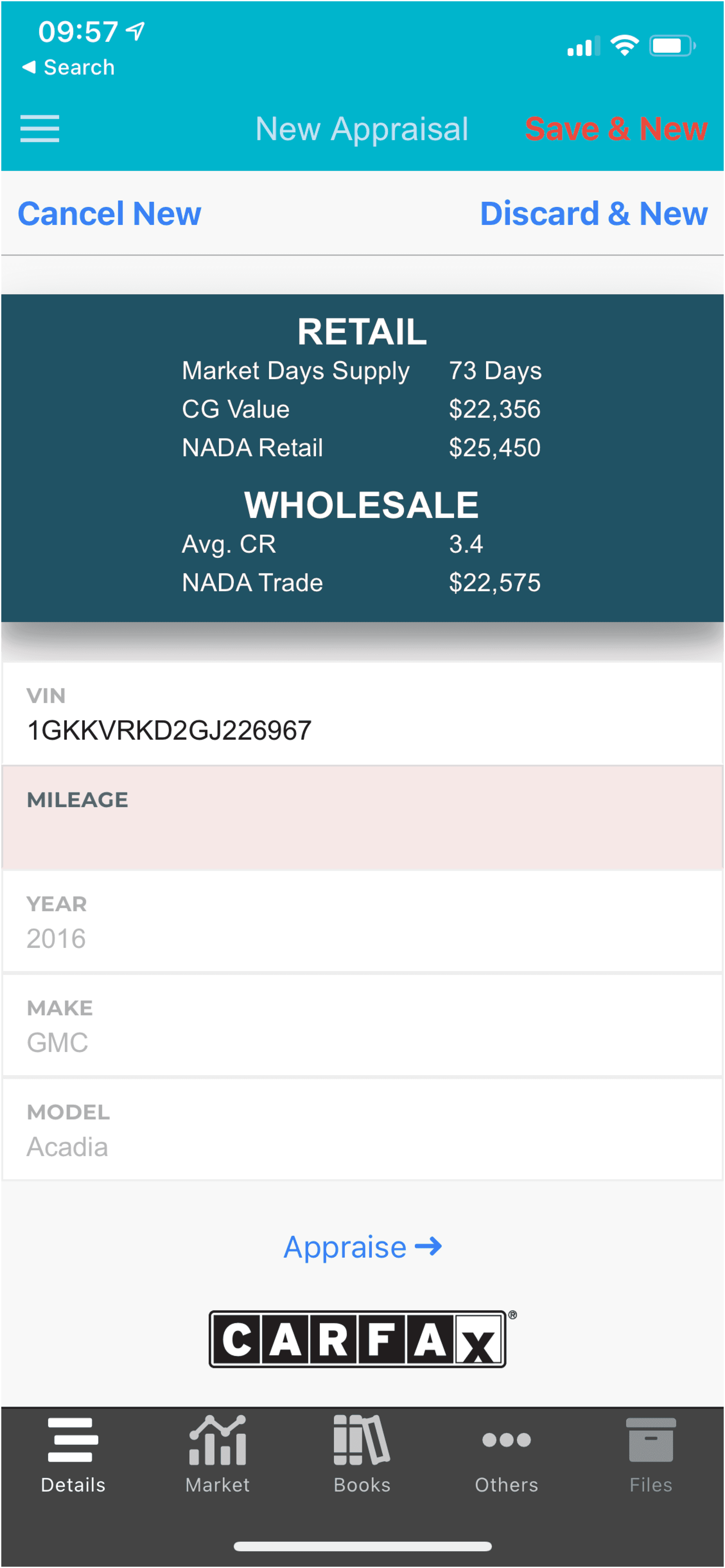 Scanning VINs is going to be the most common thing you do with appraisals, and it's really easy. The interface also allows you to quickly scan, appraise, and either discard or save while moving to scan another VIN.
