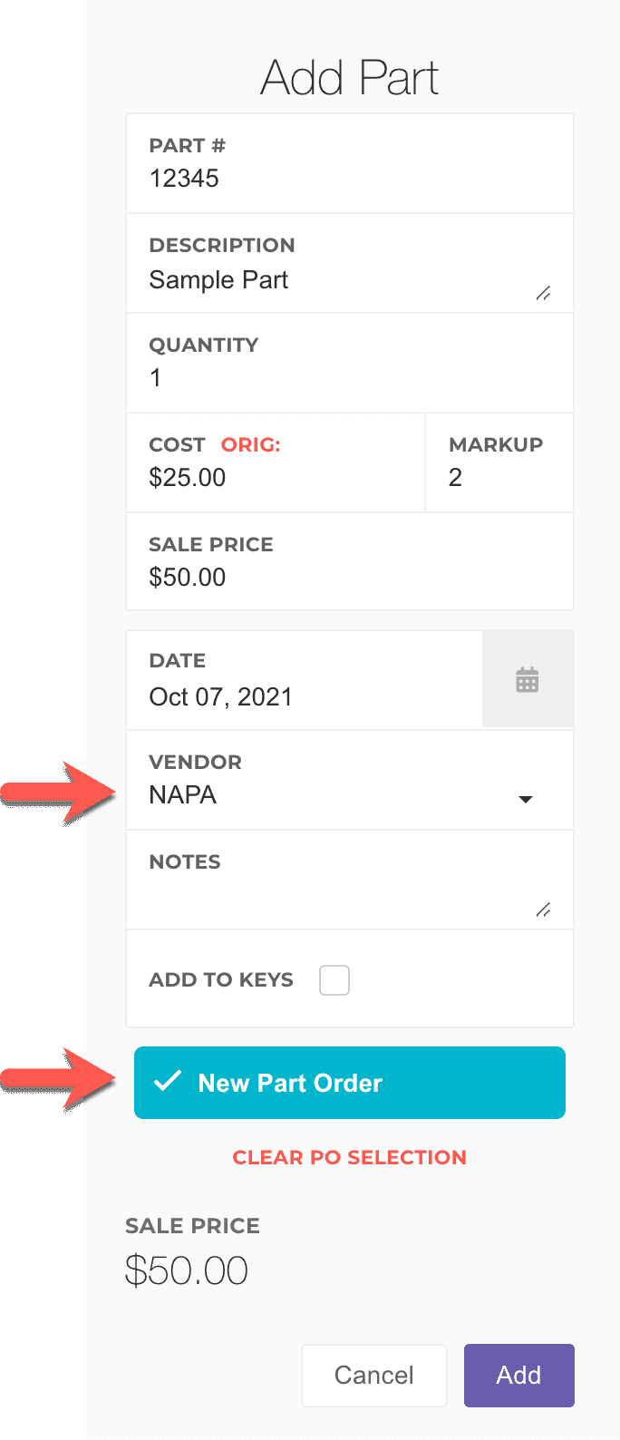 Enter or select the vendor who you're purchasing the part from (the New Part Order option will not show up if a vendor isn't selected)