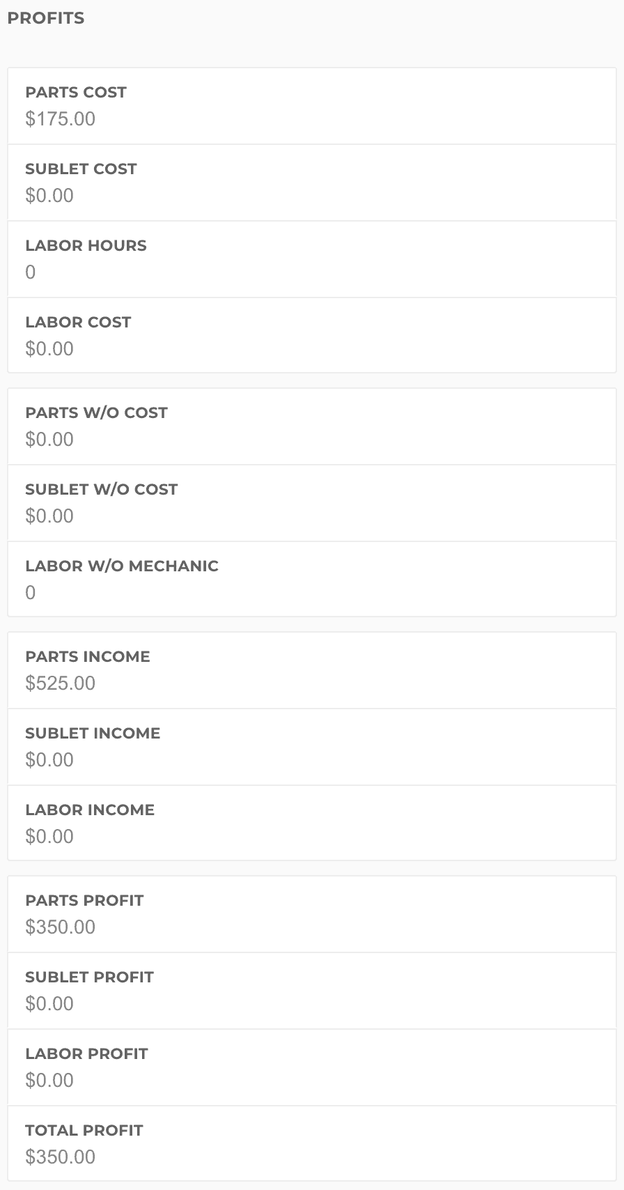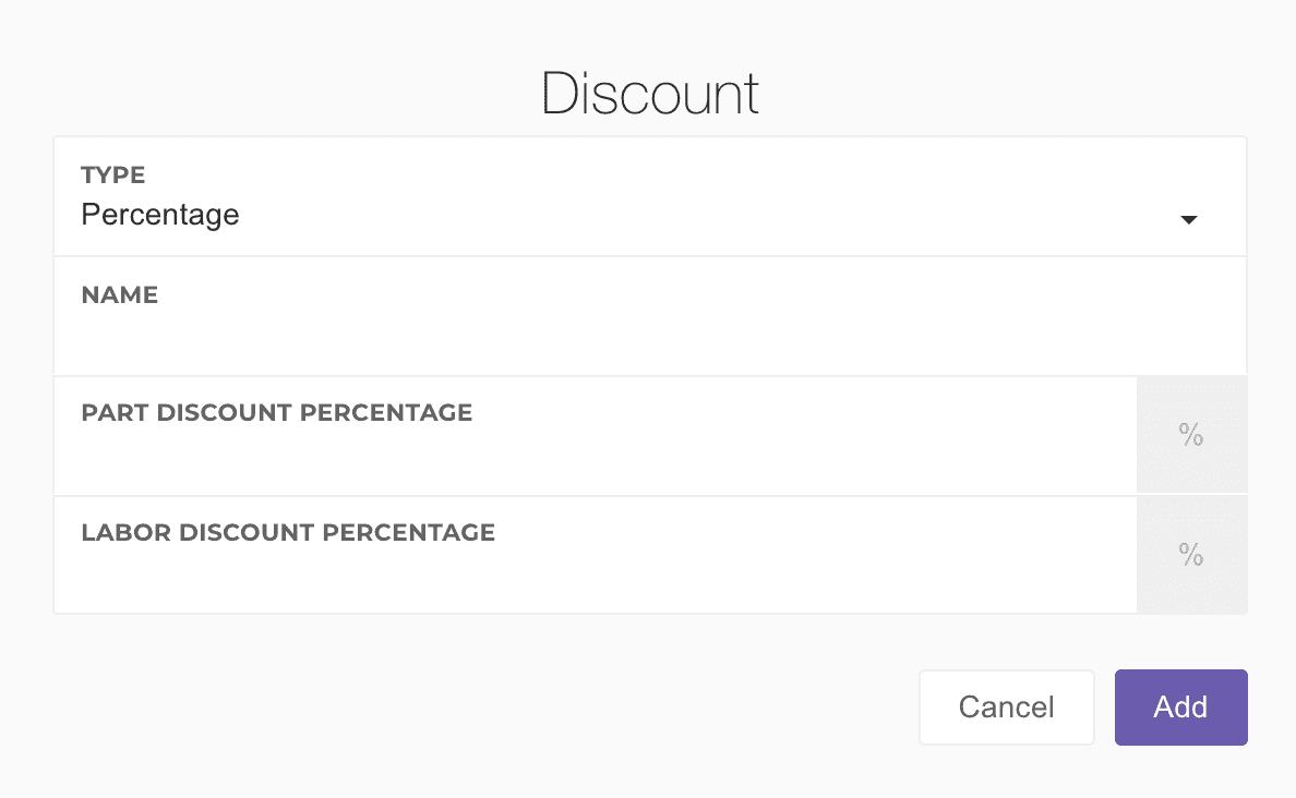 Discounts can be added as dollar amounts or percentage amounts, and assigned to parts, labor, or both.