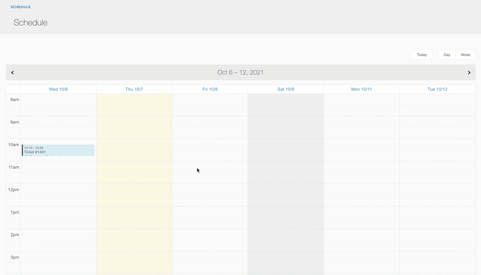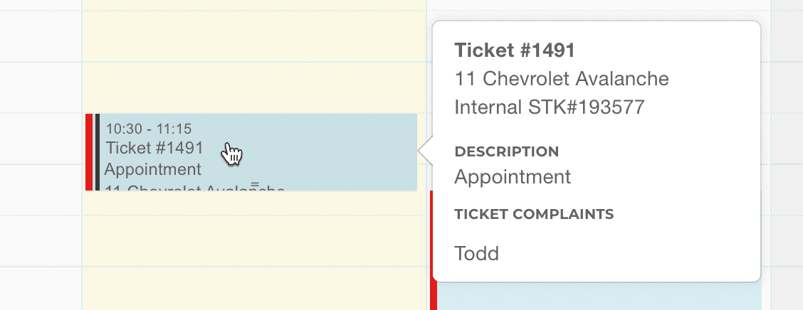 Hovering over the appointment will also show you additional details. This can be useful if the scheduled appointment is too short to see the full description, or if you want to see the ticket complaints.