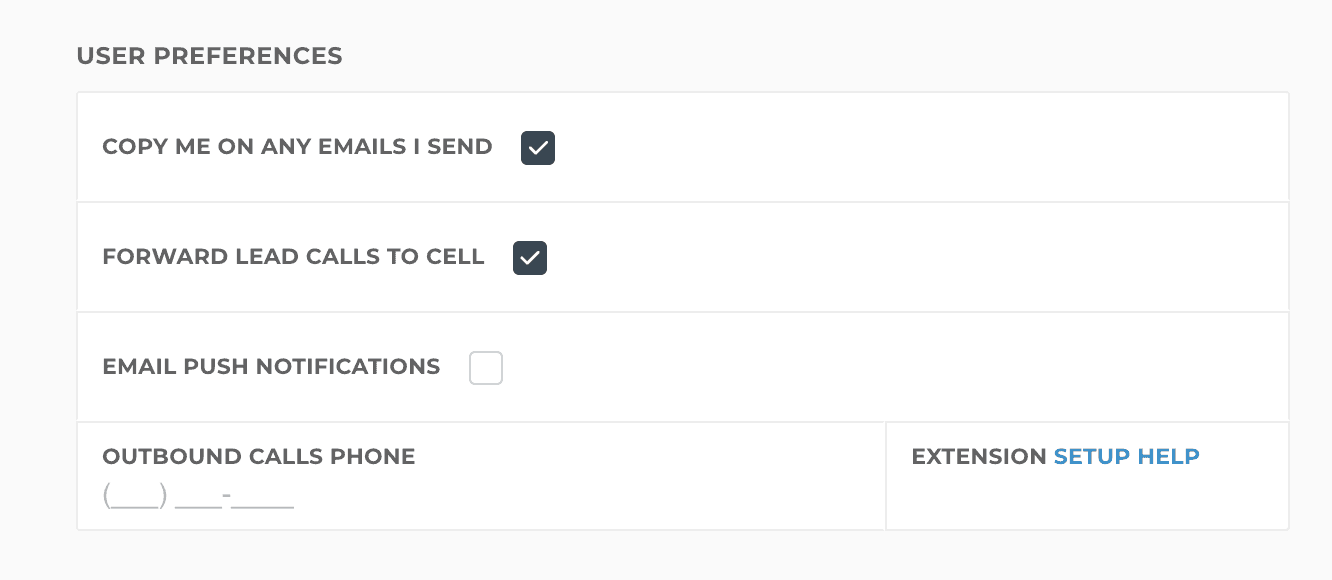 Forward Lead Calls to Cell - This feature ensures that all phone calls from leads assigned to you will be transferred directly to your inputted cell phone number if the lead were to call the number assigned to your account.
